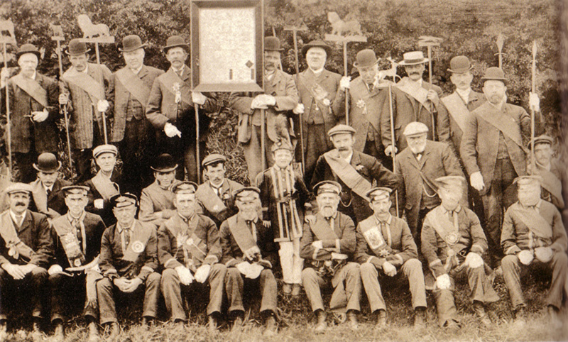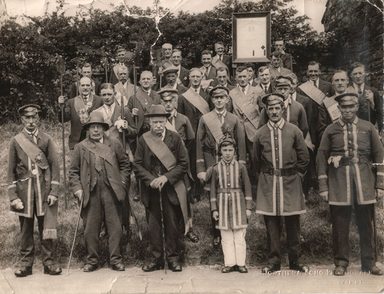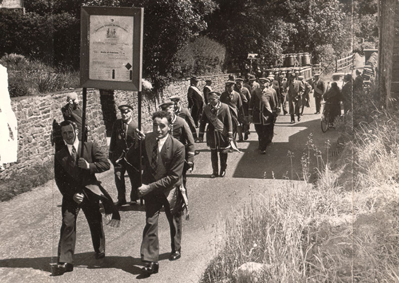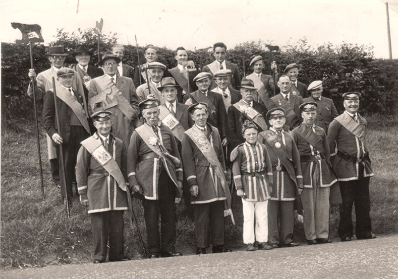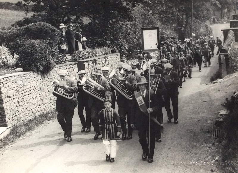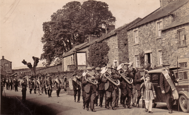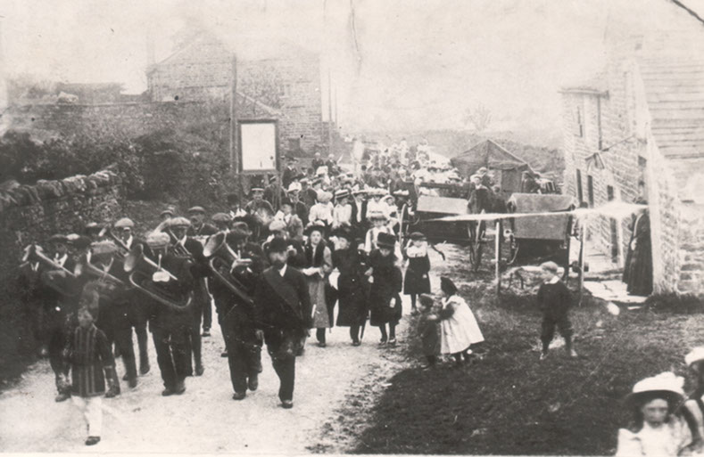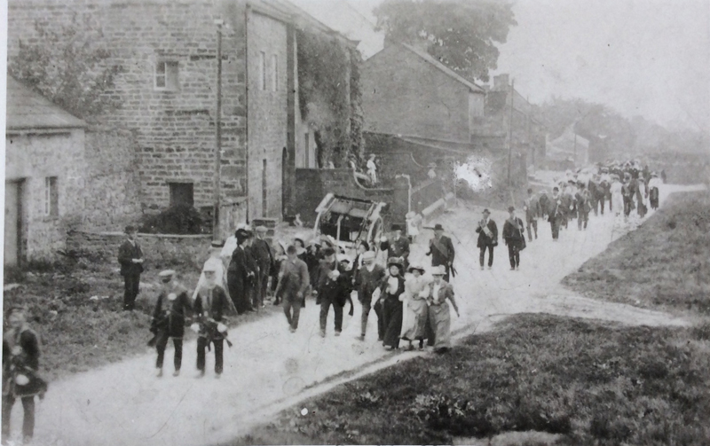 Foresters march towards the Foresters Arms public house, c.1910. The lady on the right in grey costume and white hat is Mary Grace Horner (nee Falshaw)