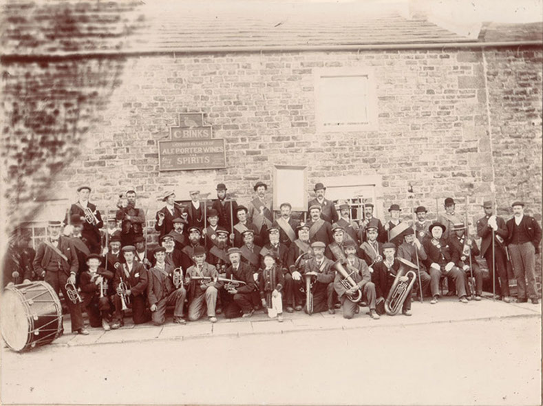 Coverdale Foresters and Coverdale band outside the Moorcock Inn, c. 1890.