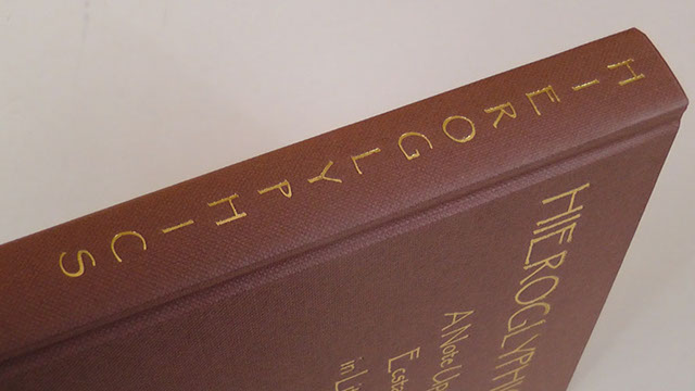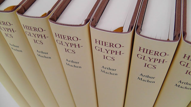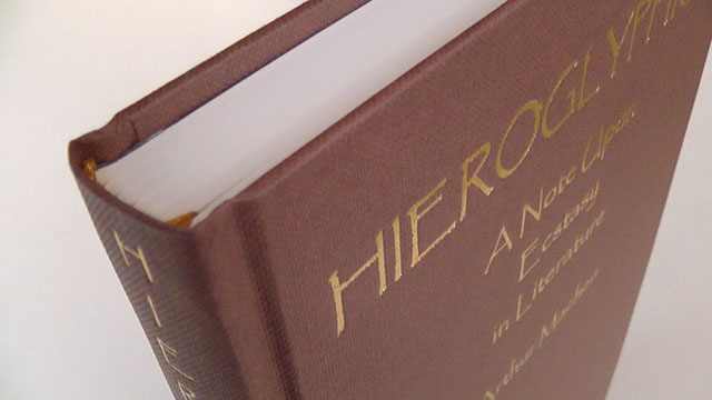 Hieroglyphics is a sewn hardback book of 197 + xviii pages with silk ribbon marker, head and tailbands, and d/w. Limited to 300 copies.