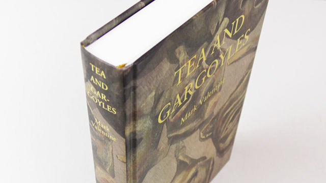 Tea and Gargoyles is a 350 copy limited edition hardback of 300 pps printed lithographically, with sewn sections, printed boards with gold blocking, silk ribbon marker, head and tailbands, and jacket.