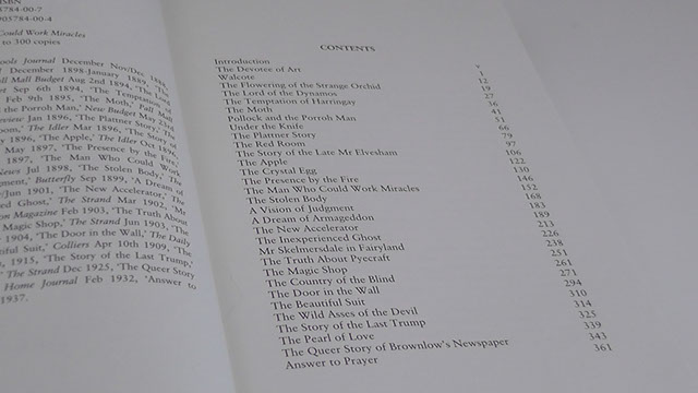 Contents: 'Introduction', 'The Devotee of Art', 'Walcote', 'The Flowering of the Strange Orchid', 'The Lord of the Dynamos', 'The Temptation of Harringay', 'The Moth', 'Pollock and the Porroh Man', 'Under the Knife', 'The Plattner Story', 'The Red Room', 'The Story of the Late Mr Elvesham', 'The Apple', 'The Crystal Egg', 'The Presence by the Fire', 'The Man Who Could Work Miracles', 'The Stolen Body', 'A Vision of Judgment', 'A Dream of Armageddon', 'The New Accelerator', 'The Inexperienced Ghost', 'Mr Skelmersdale in Fairyland', 'The Truth About Pyecraft', 'The Magic Shop', 'The Country of the Blind', 'The Door in the Wall', 'The Beautiful Suit', 'The Wild Asses of the Devil', 'The Story of the Last Trump', 'The Pearl of Love', 'The Queer Story of Brownlow's Newspaper', 'Answer to Prayer'.