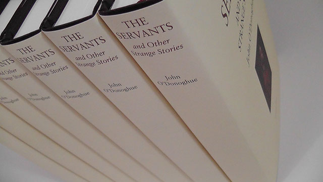 The Servants and Other Strange Stories is a sewn hardback book of 283pp, printed lithographically with silk ribbon marker, printed boards, and head and tailbands.