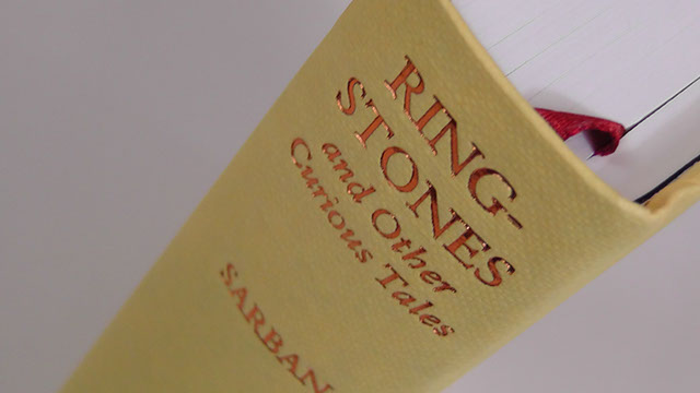 Ringstones and Other Curious Tales is a sewn hardback book, printed on 110gsm acid-free paper, bound in yellow wibalin cloth stamped in copper, with a silk ribbon marker and head and tailbands.