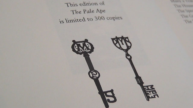 The Pale Ape and Other Pulses is a sewn hardback of 211+ xiv pages, printed lithographically, with silk ribbon marker, head and tailbands, and d/w.