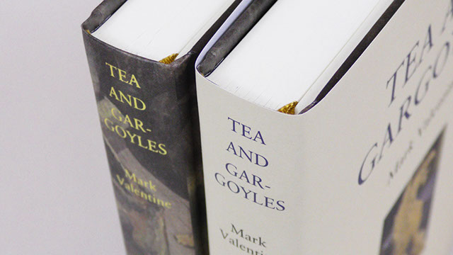 Tea and Gargoyles is a 350 copy limited edition hardback of 300 pps printed lithographically, with sewn sections, printed boards with gold blocking, silk ribbon marker, head and tailbands, and jacket.